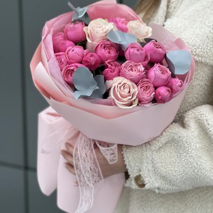 Букет Нимфа с кустовыми пионовидными и одноголовыми розами