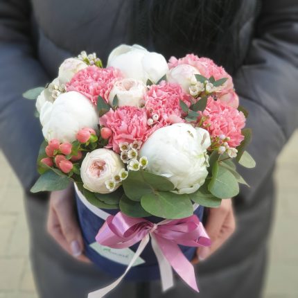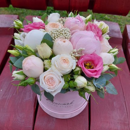 Бархатный цилиндр из тюльпанов, озотамнуса и пионовидной розы