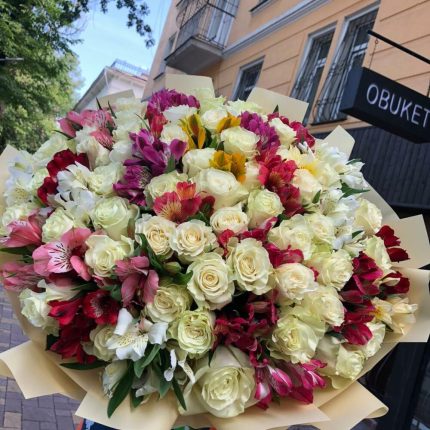 Коробка Жемчужина красоты из кустовых роз, альстромерии, эустомы и диантуса