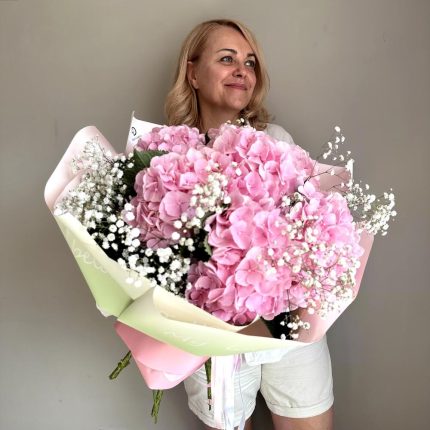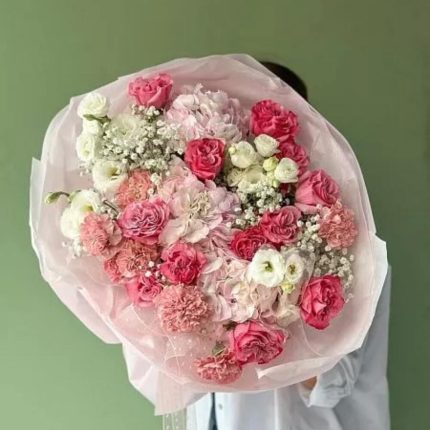 Букет из лилий, гортензии, эустомы, роз, гвоздики и гипсофилы в корзине “Карндона”
