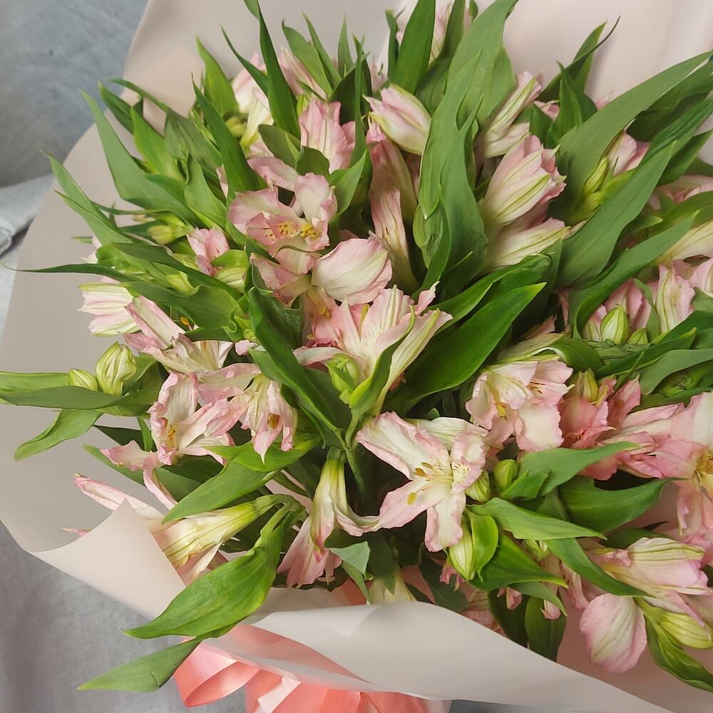 Альстромерия – 19 шт.Упаковка дизайнерская – 1 шт.Лента атласная – 1 шт.