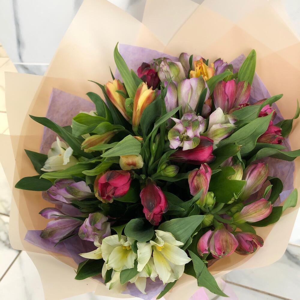 альстромерия микс – 11 шт.Рускус сочи – 10 шт.Пленка матовая – 1 шт.Лента атласная – 1 шт.