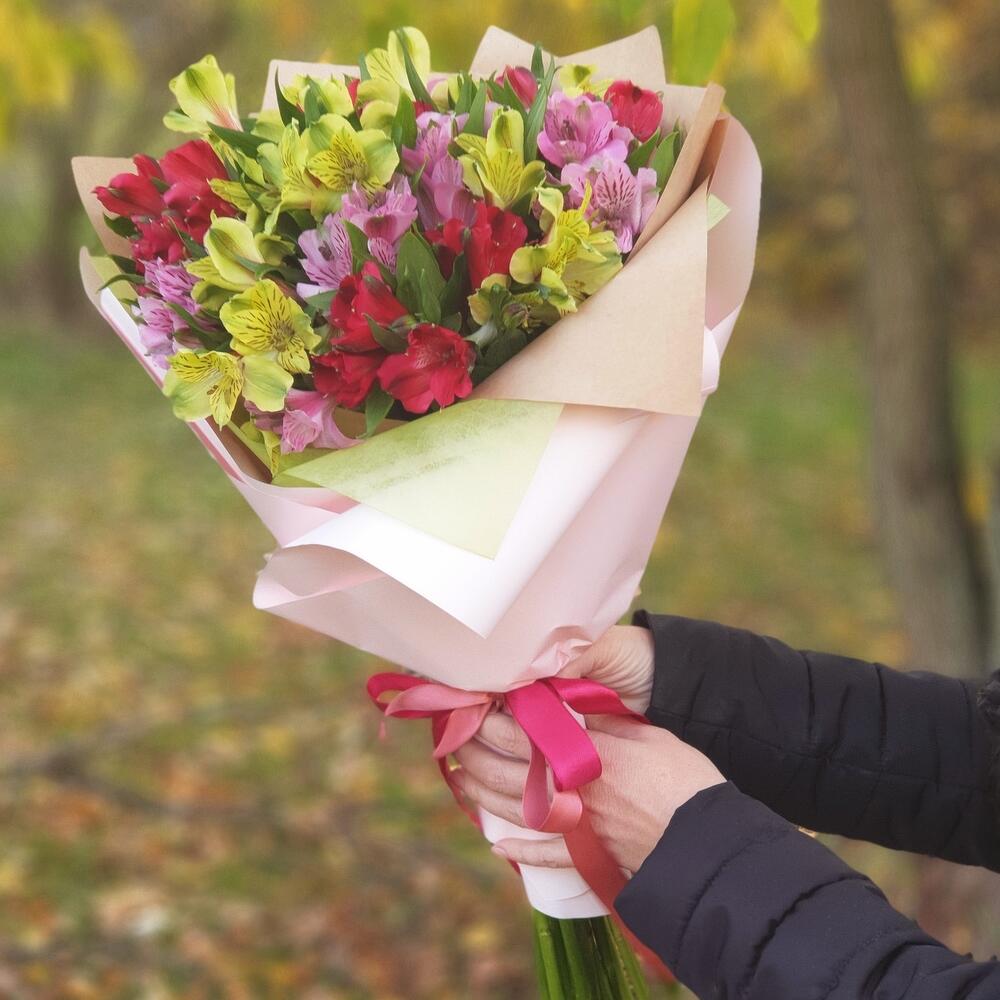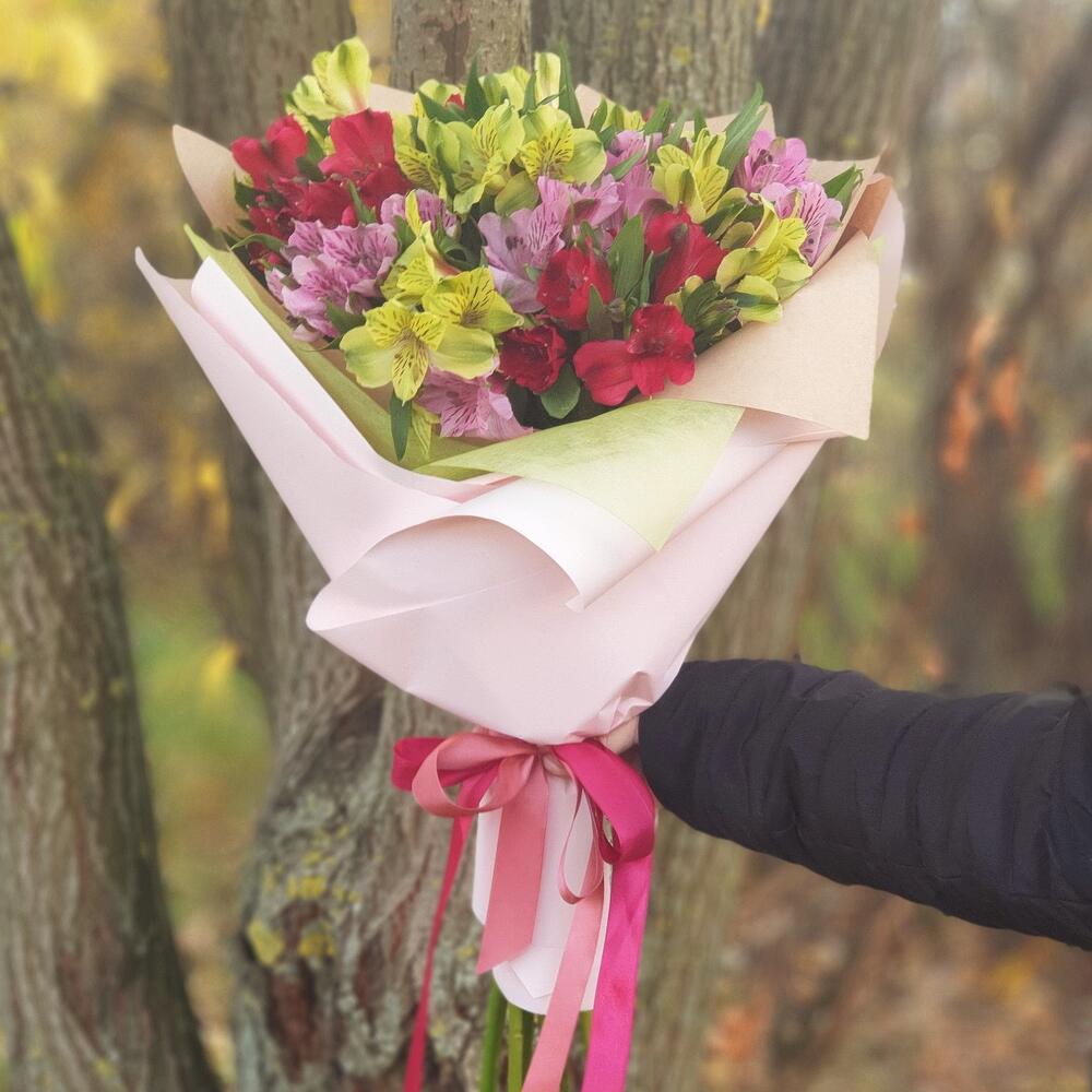 Лента атласная – 2 шт.Упаковка дизайнерская – 3 шт.Открыточка с вашими пожеланиями – 1 шт.Альстромерия Микс Европа – 9 шт.любовь флориста (бесплатно) – 1 шт.