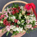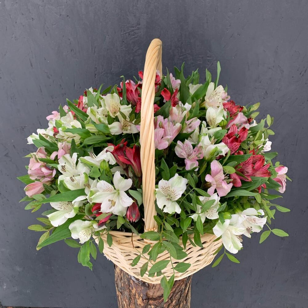 Альстромерия – 21 шт.Оазис – 1 шт.Фисташка – 10 шт.Корзина плетеная – 1 шт.