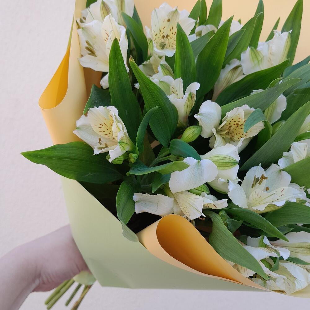 Альстромерия – 7 шт.Салал – 3 шт.Лента атласная – 2 шт.Упаковка дизайнерская – 3 шт.
