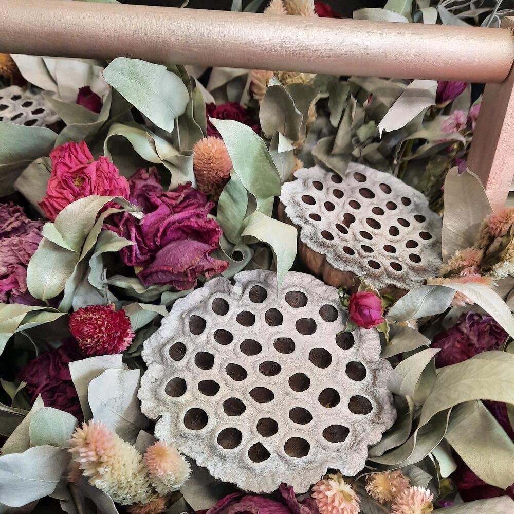 Целозия – 5 шт.Эвкалипт – 10 шт.Ящик деревянный – 1 шт.Лотос сухой – 3 шт.Оазис флористический – 2 шт.Клевер – 9 шт.