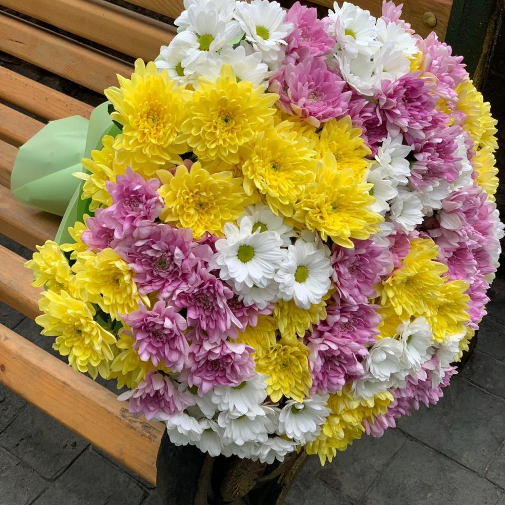 Прекрасный, большой букет из разноцветных хризантем в стильном оформлении.