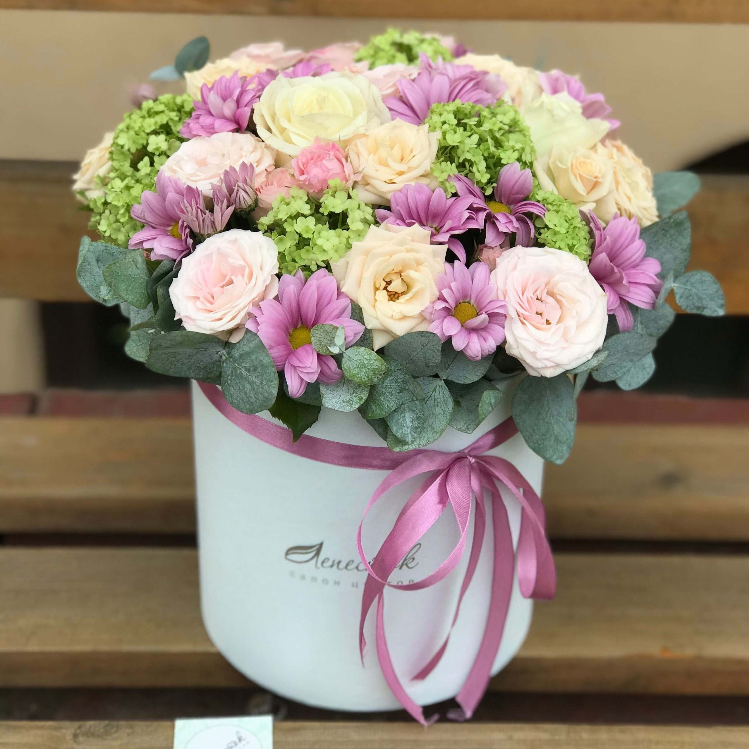 Шляпная коробка с хризантемой, гипсофилой и фисташкой
