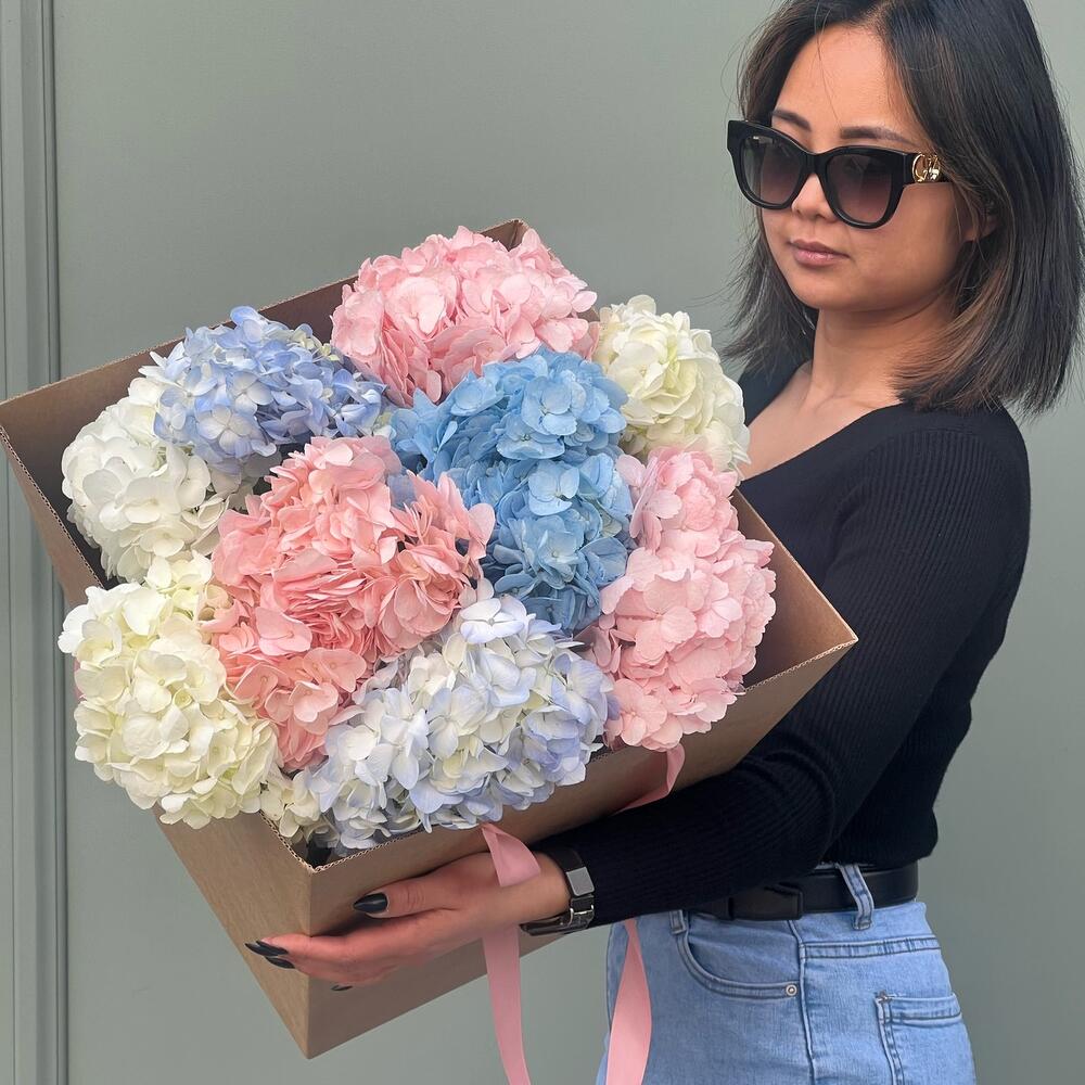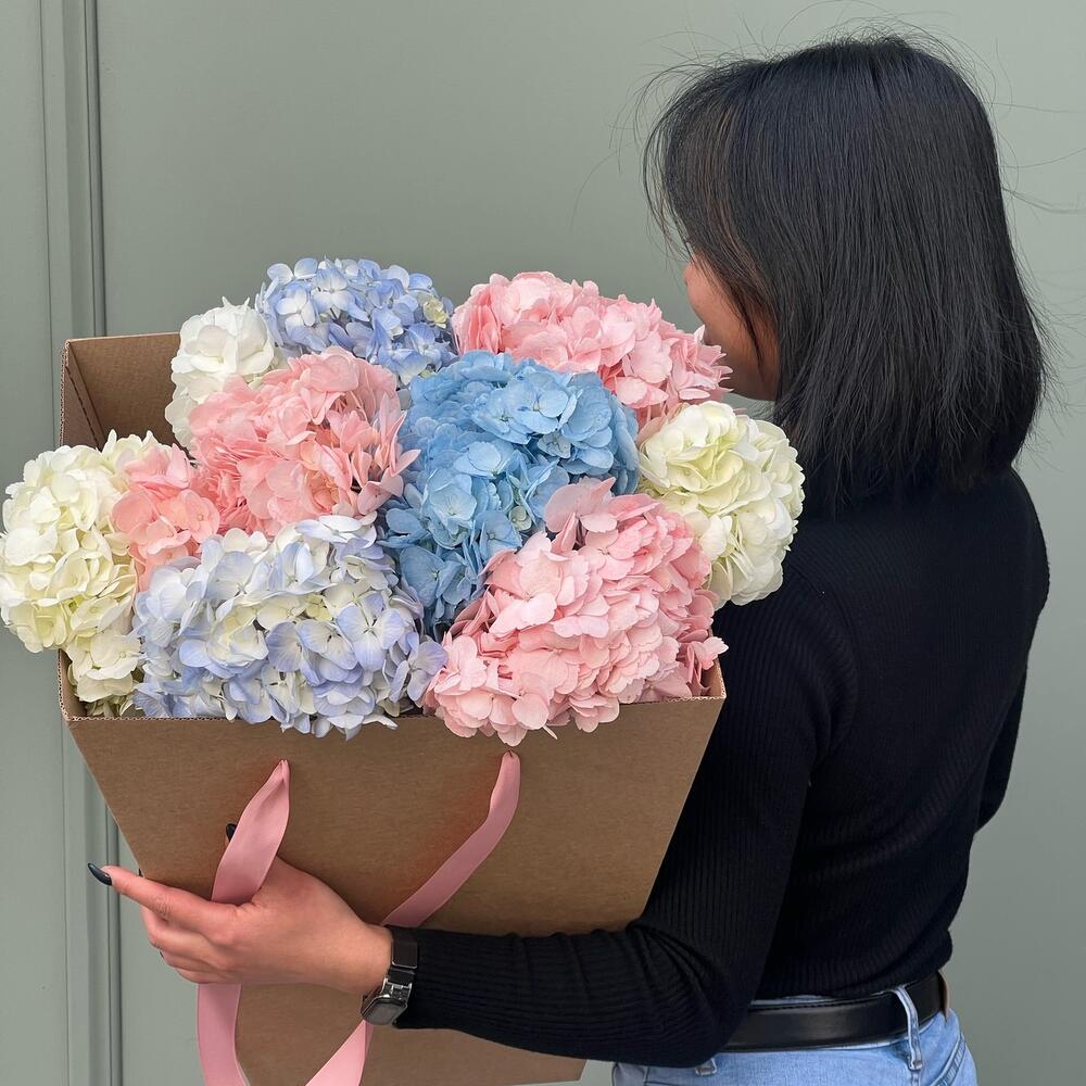 Сборная корзина из гортензий, лизиантусов, гвоздик, хризантем и роз