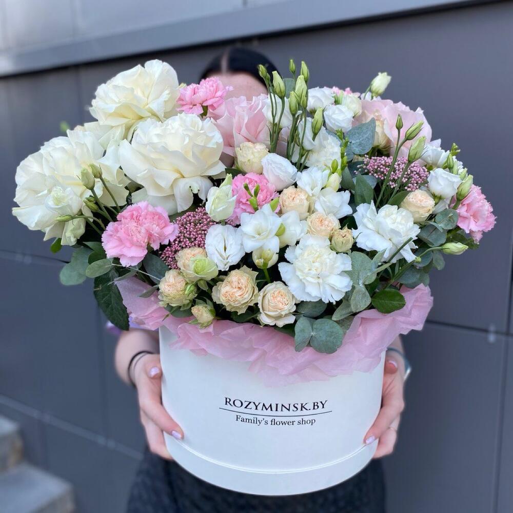 Лента – 1 шт. Тишью – 1 шт. Шляпная коробка – 1 шт. Флористический оазис – 1 шт.