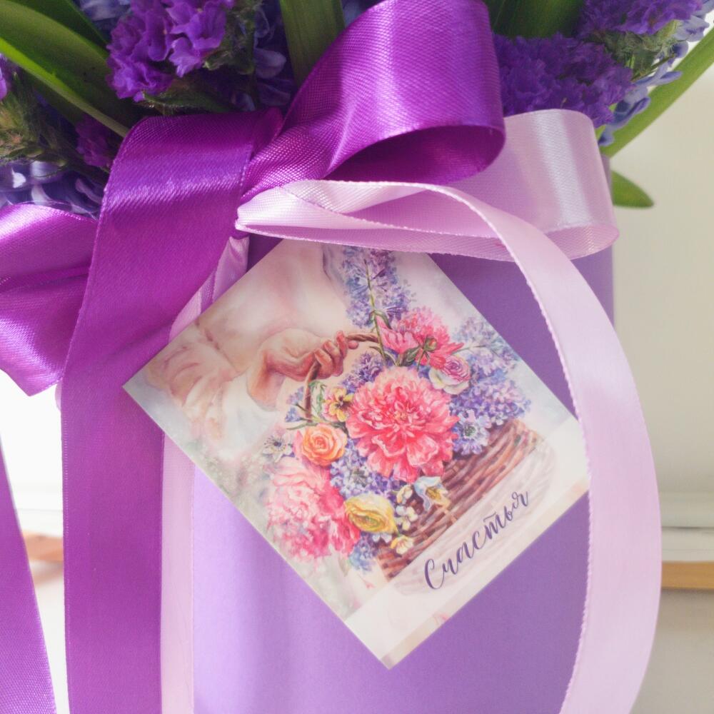 Лента атласная – 2 шт.Коробка шляпная – 1 шт.Статица фиолетовая – 3 шт.Аквапак – 1 шт.Открыточка с вашими пожеланиями – 1 шт.гиацинты – 15 шт.