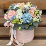 Цилиндр из пионов, пионовидных роз, лизиантусов