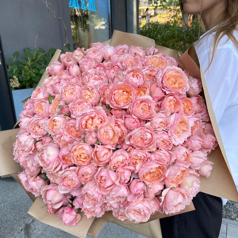 Піоновидна кущова троянда сорту Juliet в крафтовому пакуванні