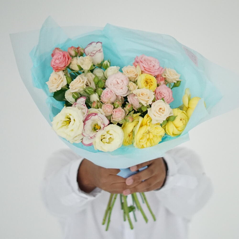 peony spray rose – 7 шт. Lisianthus – 3 шт. gift message card – 1 шт. packaging design – 2 шт. care instruction – 1 шт. free delivery – 1 шт.