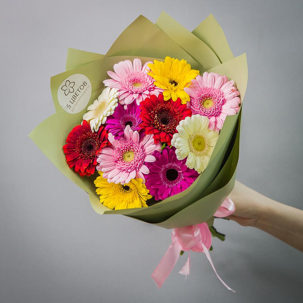 Гербера розовая – 3 шт.Гербера желтая – 3 шт.Гербера белая – 3 шт.Гербера красная – 2 шт.Фисташка – 1 шт.