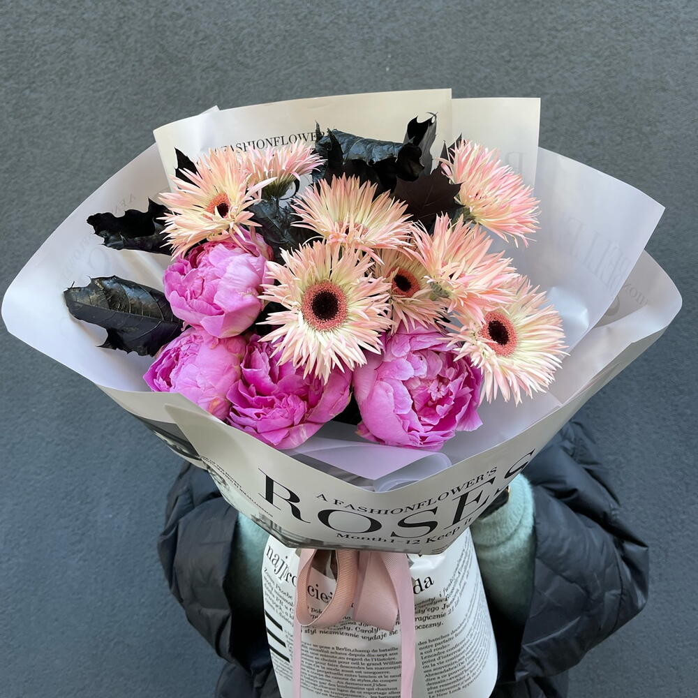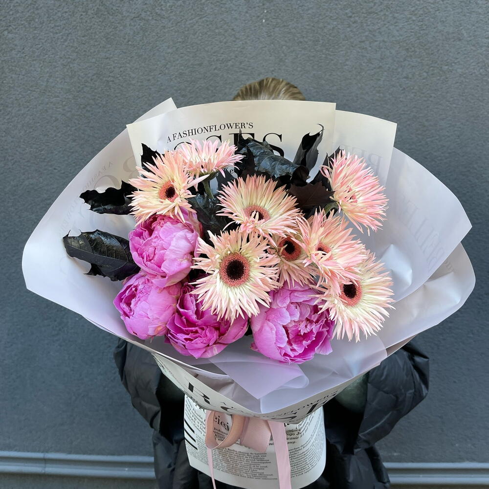 Букет в рожевих тонах. Ніжна композиція, яка включає в себе рожеву герберу, півонії сорту Sarah Bernhardt та фарбоване листя в стильному пакуванні.