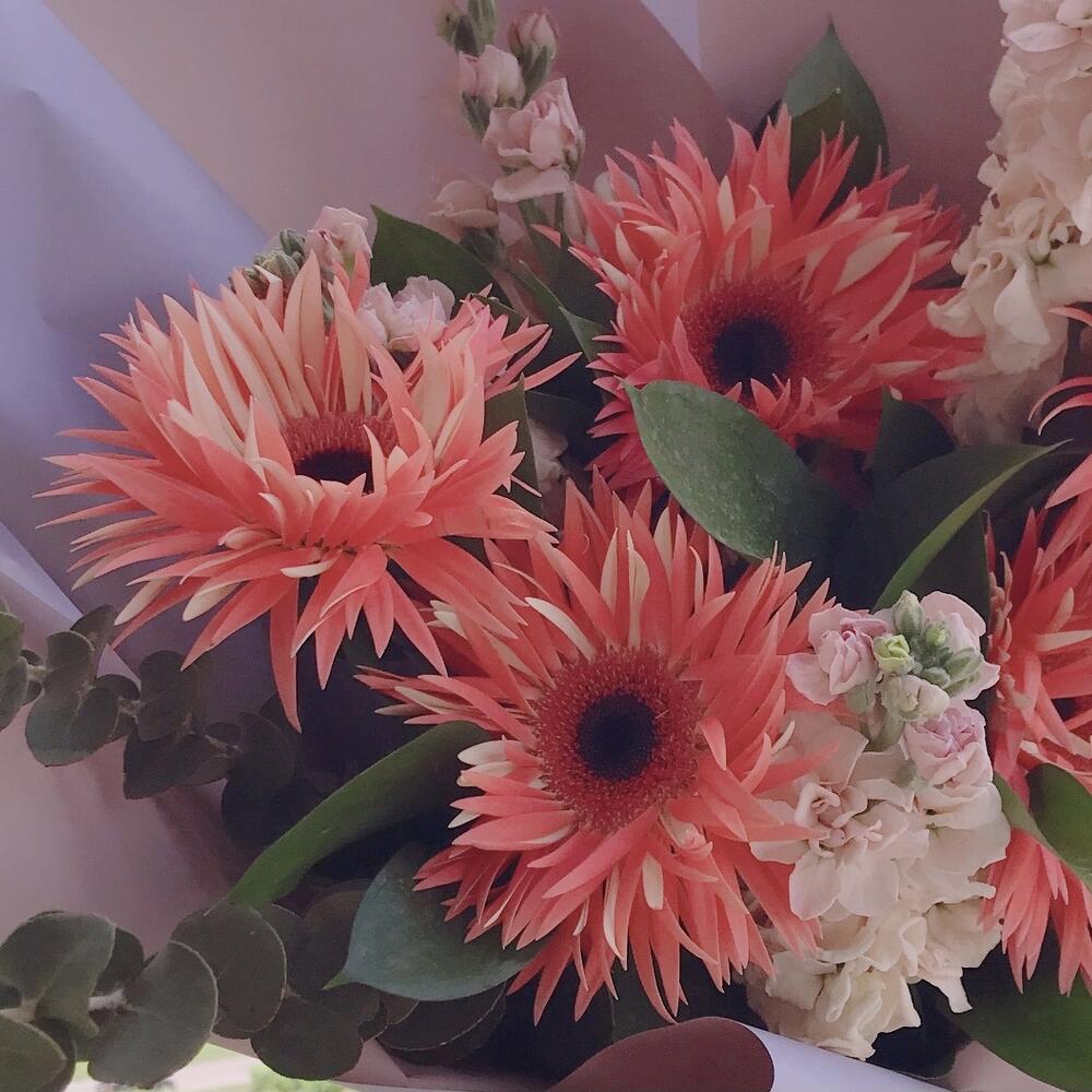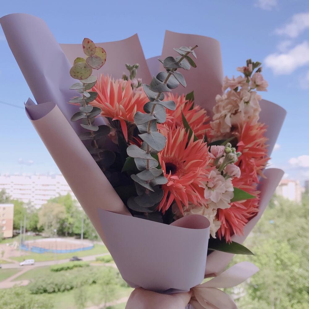 Маттиола – 4 шт.Рускус – 1 шт.Эвкалипт – 2 шт.Лента атласная – 1 шт.Упаковка дизайнерская – 1 шт.инструкция по уходу за цветами – 1 шт.любовь флориста – 1 шт.махровая гербера – 5 шт.витамины для цветов – 1 шт.