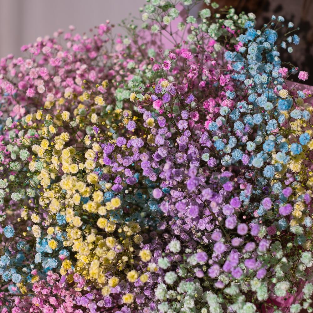 радужная гипсофила – 15 шт.Дизайнерская упаковка – 2 шт.Лента атласная – 1 шт.любовь флориста (бесплатно) – 1 шт.подкормка для срезанных цветов – 1 шт.инструкция по уходу за цветами – 1 шт.