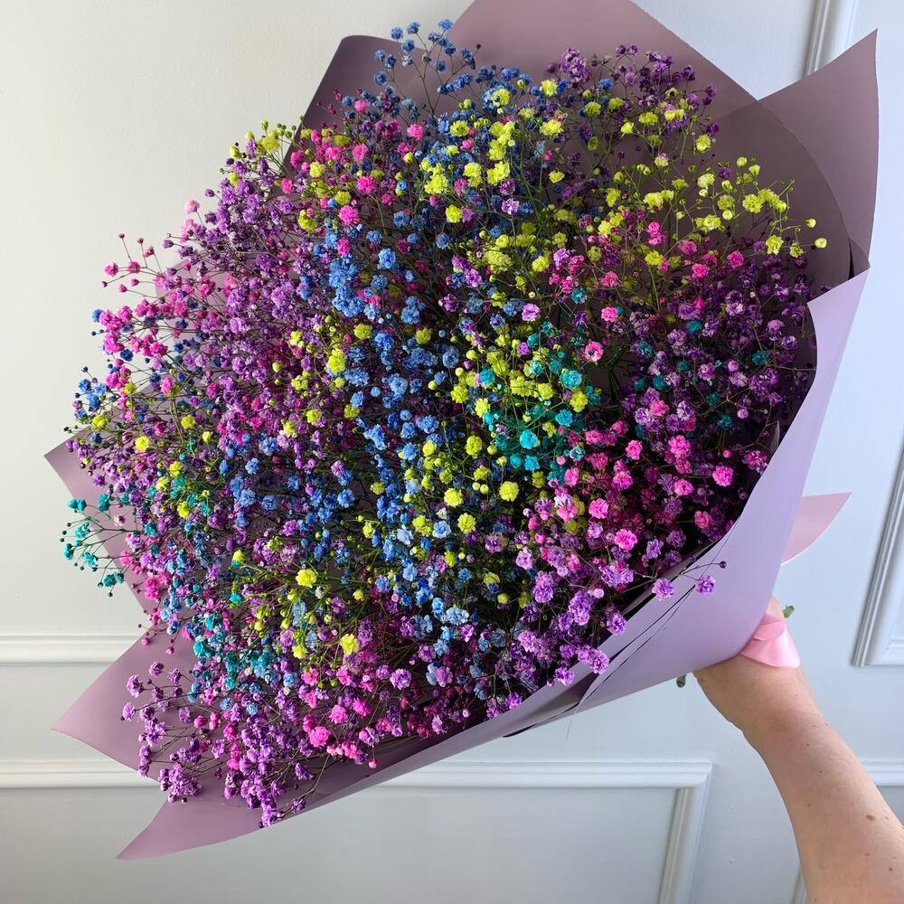 Лента атласная – 1 шт.Пленка дизайнерская – 1 шт.гипсофила радужная – 11 шт.