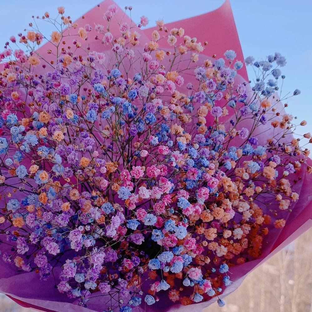 Лента атласная – 1 шт.Упаковка дизайнерская – 1 шт.инструкция по уходу за цветами – 1 шт.радужная гипсофила – 3 шт.витамины для цветов – 1 шт.