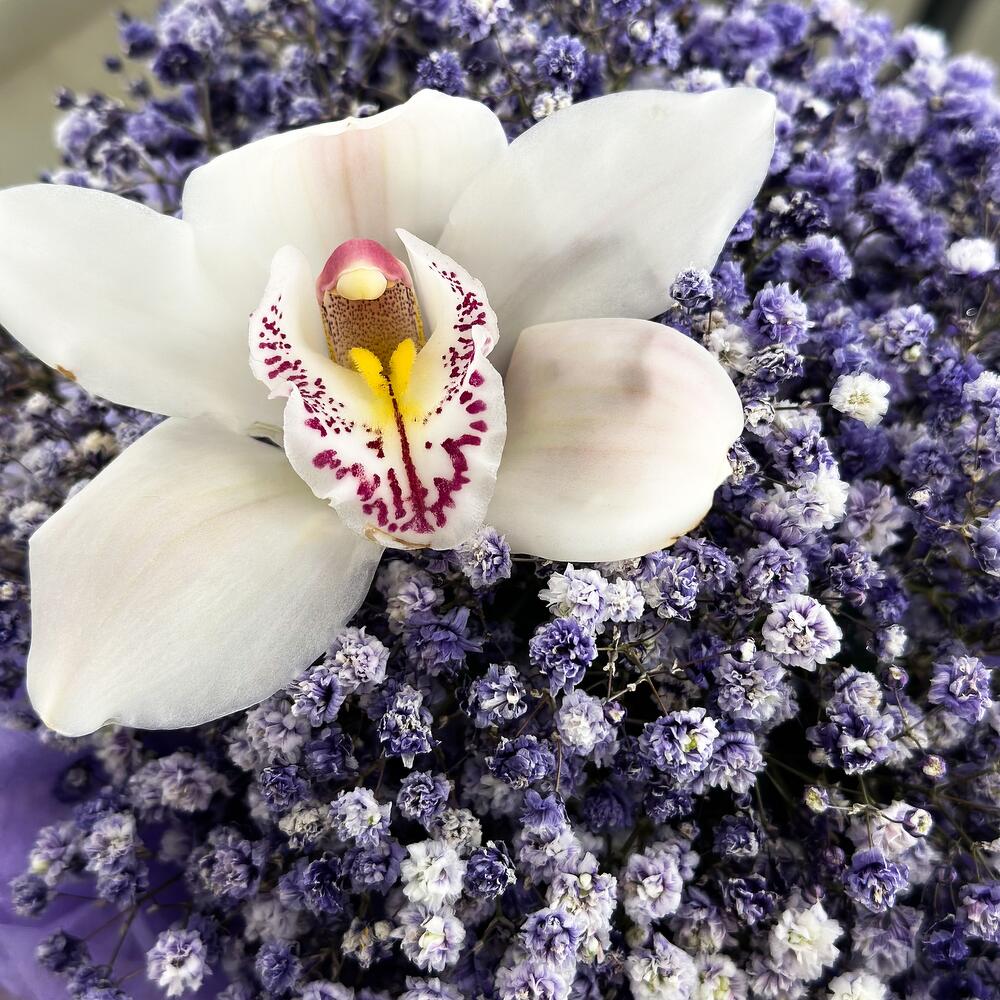 Играющая, сиреневая гипсофила с долгоиграющей Орхидеей собрана в одну стильную шляпную коробку!Благодаря пышности этих цветов,букет смотрится словно воздушный закат уходящий вдаль!Яркий и необычный комплимент для любого повода!Добавляйте товар и магазин в избранное,чтобы было легче нас найти