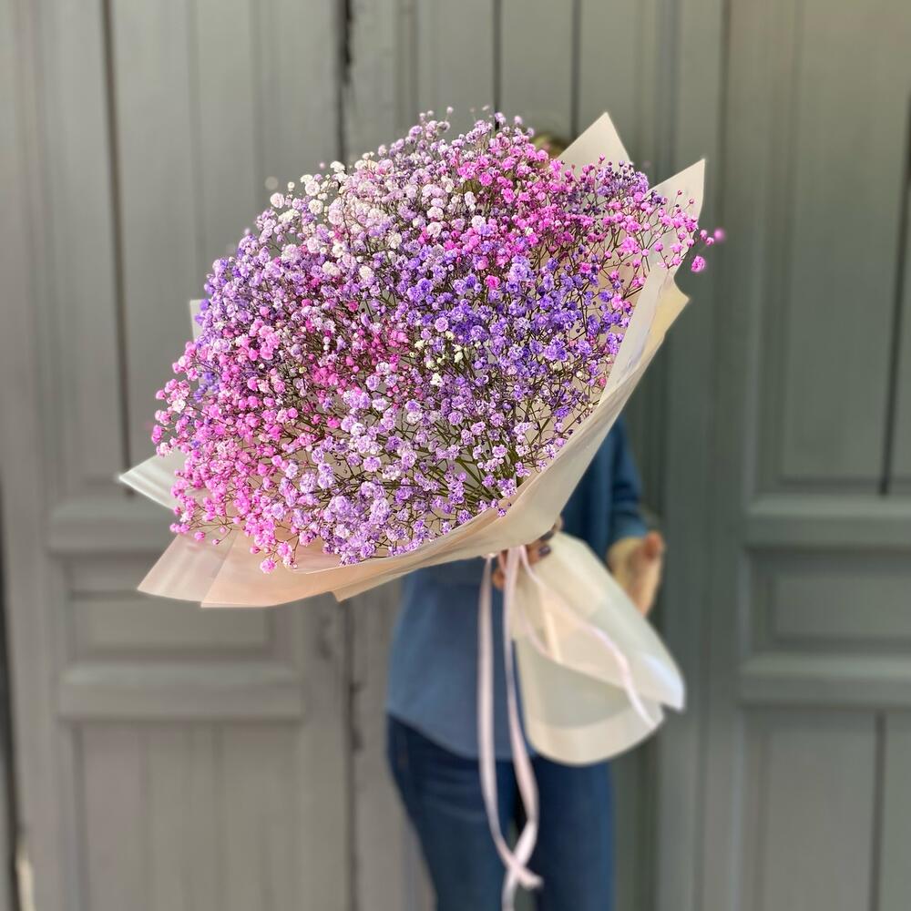 Гипсофила – 9 шт.Упаковка дизайнерская – 4 шт.Лента атласная – 1 шт.