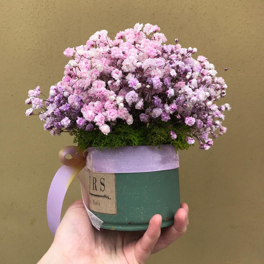 “Сиреневый туман” – композиция из гипсофилы в шляпной коробке