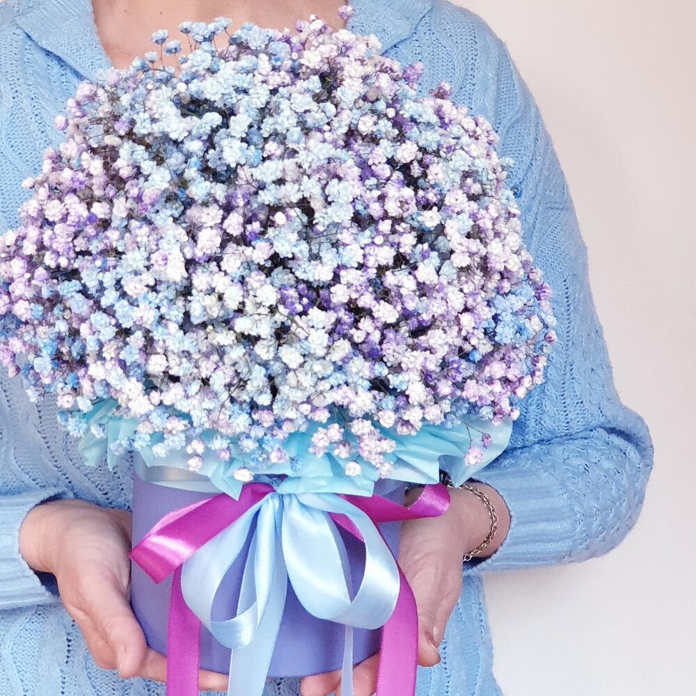 Лента атласная – 2 шт.Коробка шляпная – 1 шт.Открыточка с вашими пожеланиями – 1 шт.Оазис флористический – 1 шт.гипсофила радужная – 7 шт.любовь флориста (бесплатно) – 1 шт.