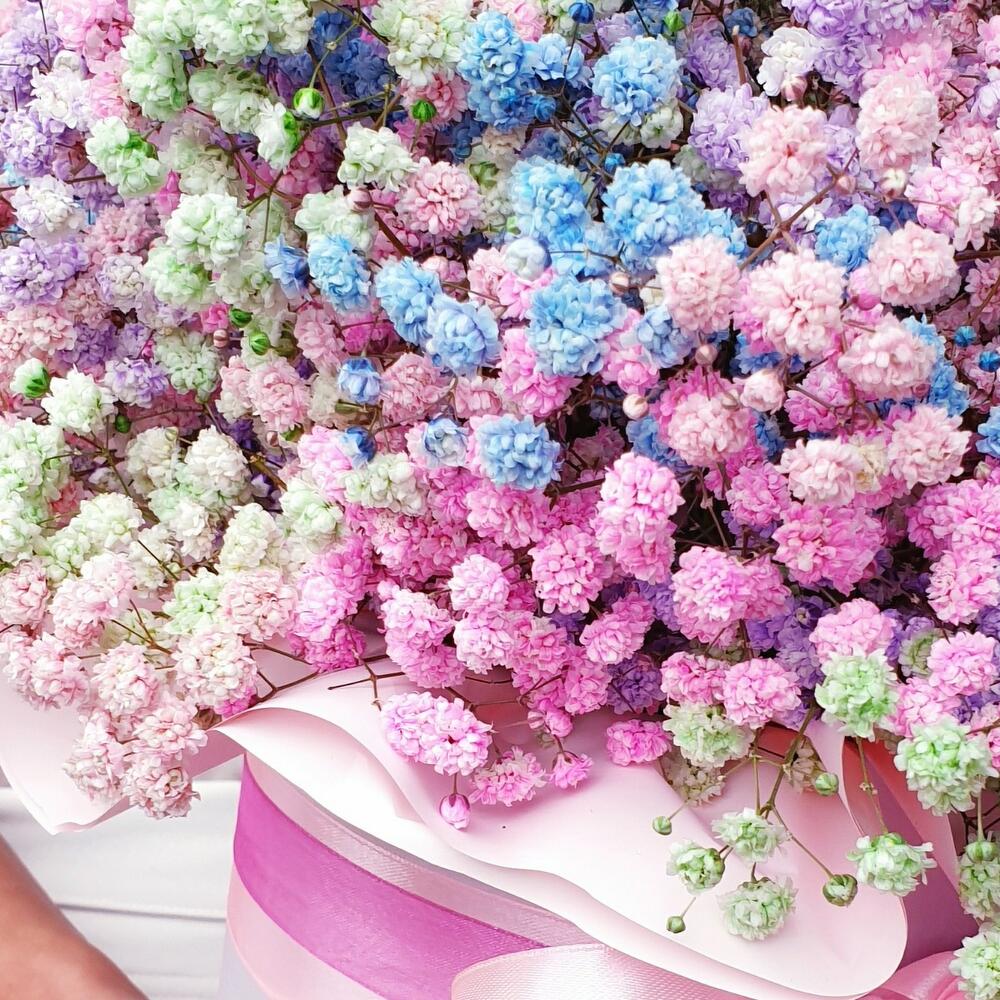 Лента атласная – 3 шт.Коробка шляпная большая – 1 шт.Открыточка с вашими пожеланиями – 1 шт.Оазис флористический – 1 шт.гипсофила радужная – 11 шт.любовь флориста (бесплатно) – 1 шт.