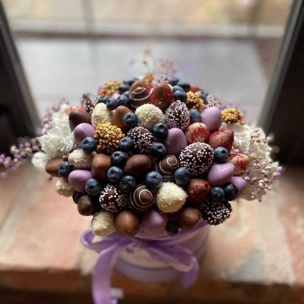 Коробка с клубникой в шоколаде, голубикой и цветами “Черничный бархат”