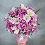Альстромерия – 5 шт. Коробка шляпная – 1 шт. Оазис флористический – 1 шт. Гипсофила розовая – 5 шт.