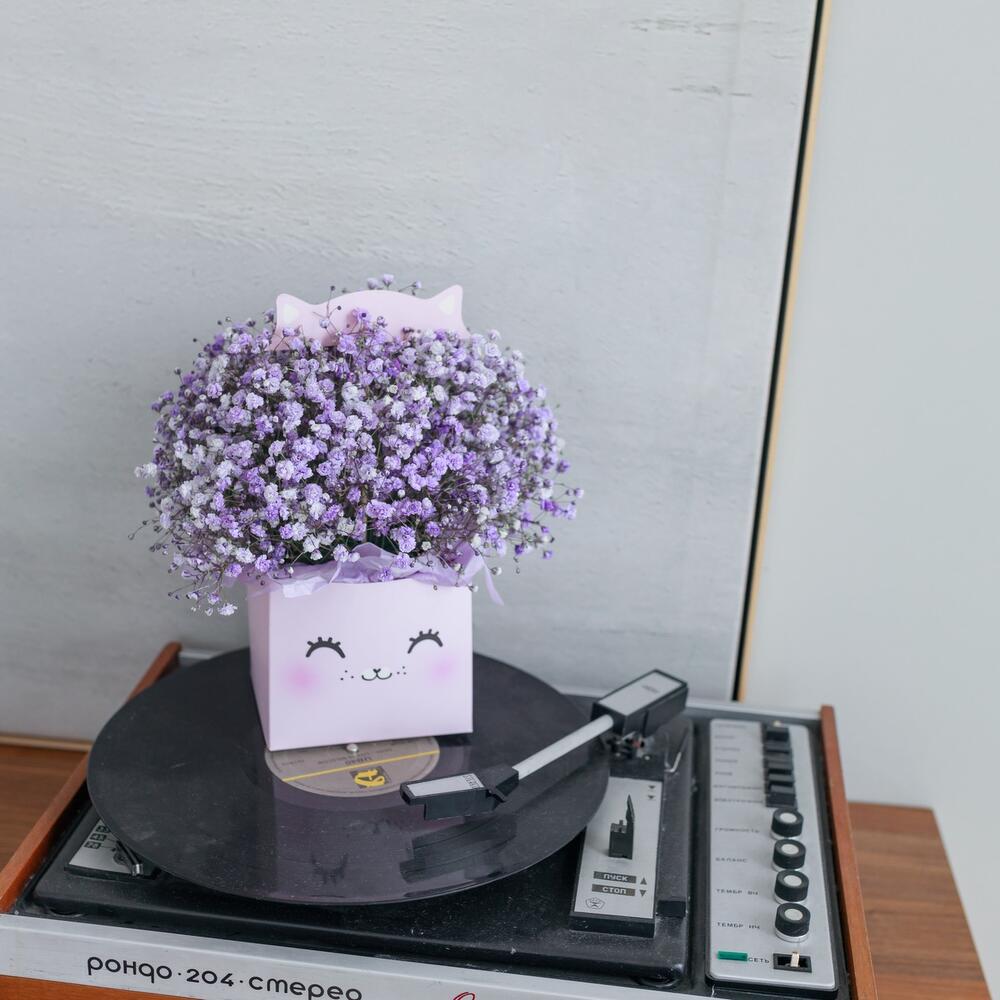 Тишью – 4 шт.Оазис флористический – 1 шт.коробка транспортировочная – 1 шт.коробка котик – 1 шт.гипсофила цветная – 5 шт.