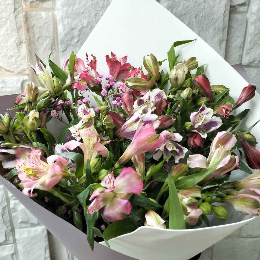 Лента атласная – 1 шт.Упаковка дизайнерская – 2 шт.Гипсофила розовая – 1 шт.альстромерия микс европа 70 см – 15 шт.