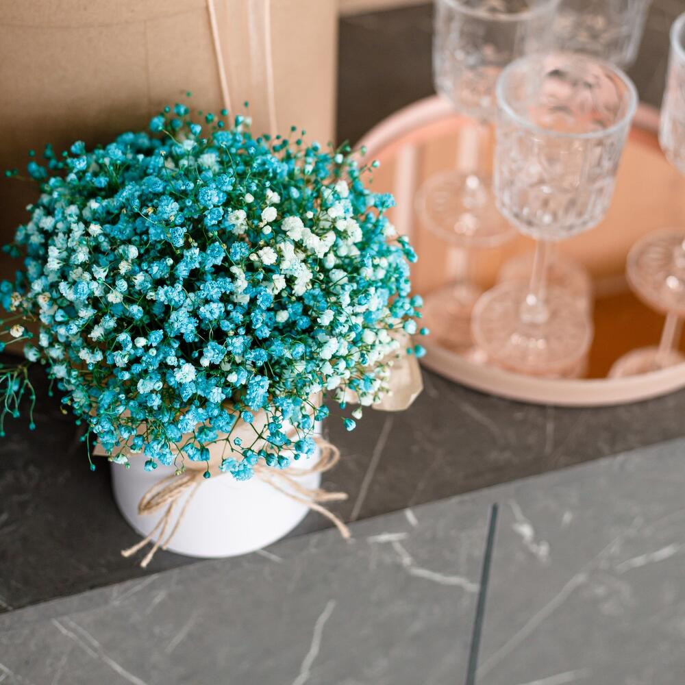 “Сиреневый туман” – композиция из гипсофилы в шляпной коробке