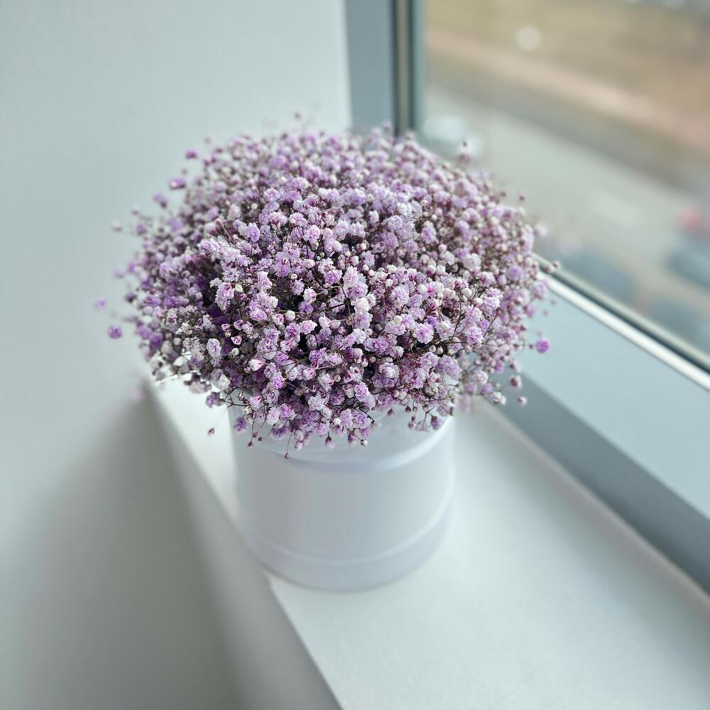 Композиция из 7 стеблей нежной фиолетовой гипсофилы в светлой шляпной коробке