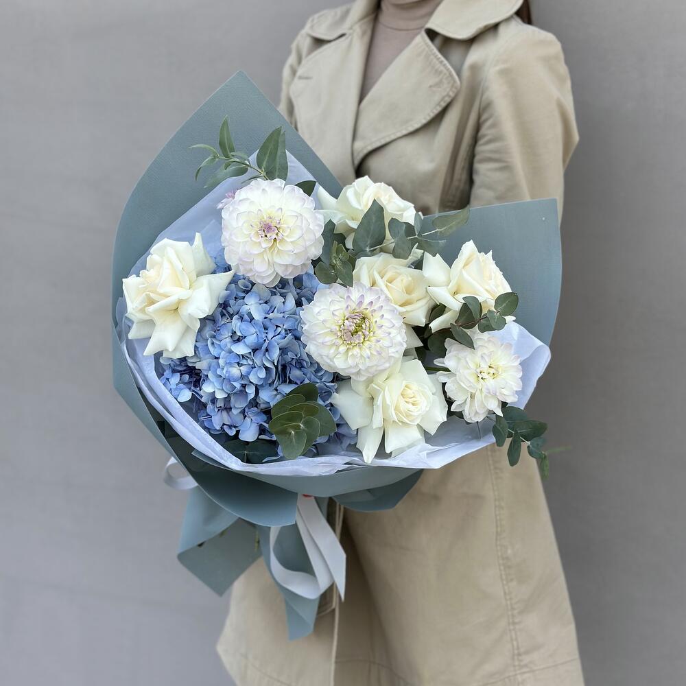 Круглый букет с гортензиями и розами