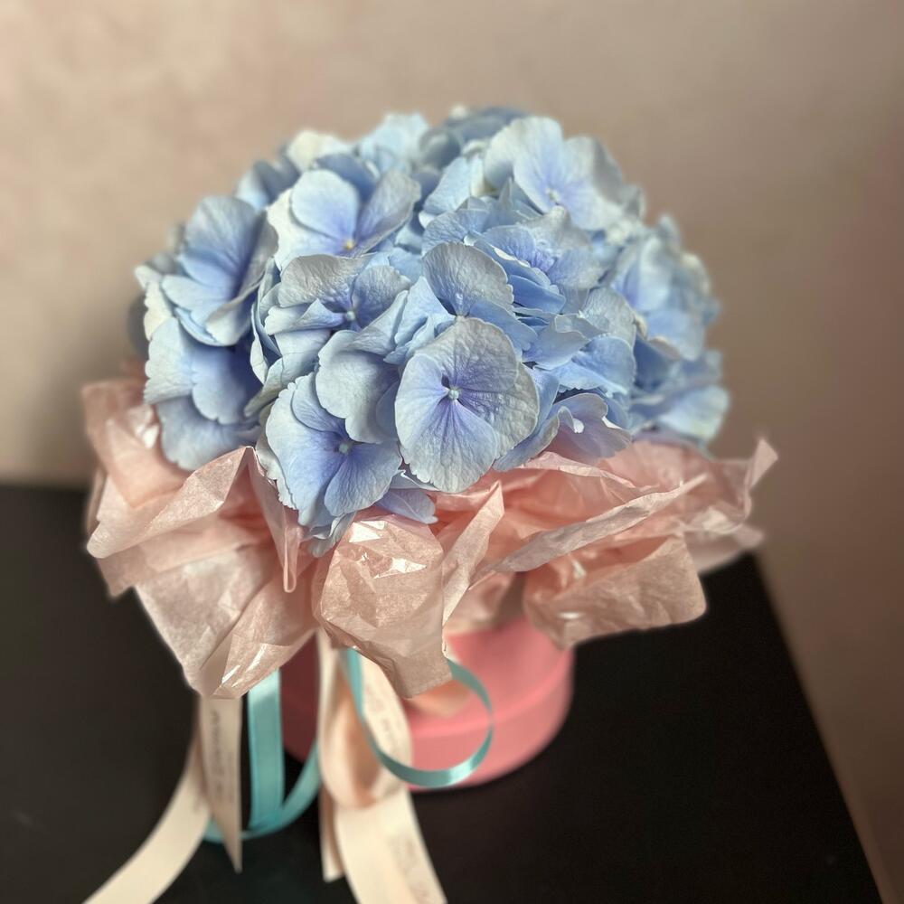 Гортензия – 1 шт.Тишью – 2 шт.Атласная лента – 1 шт.Флористическая губка (оазис) – 1 шт.шляпная коробочка s – 1 шт.