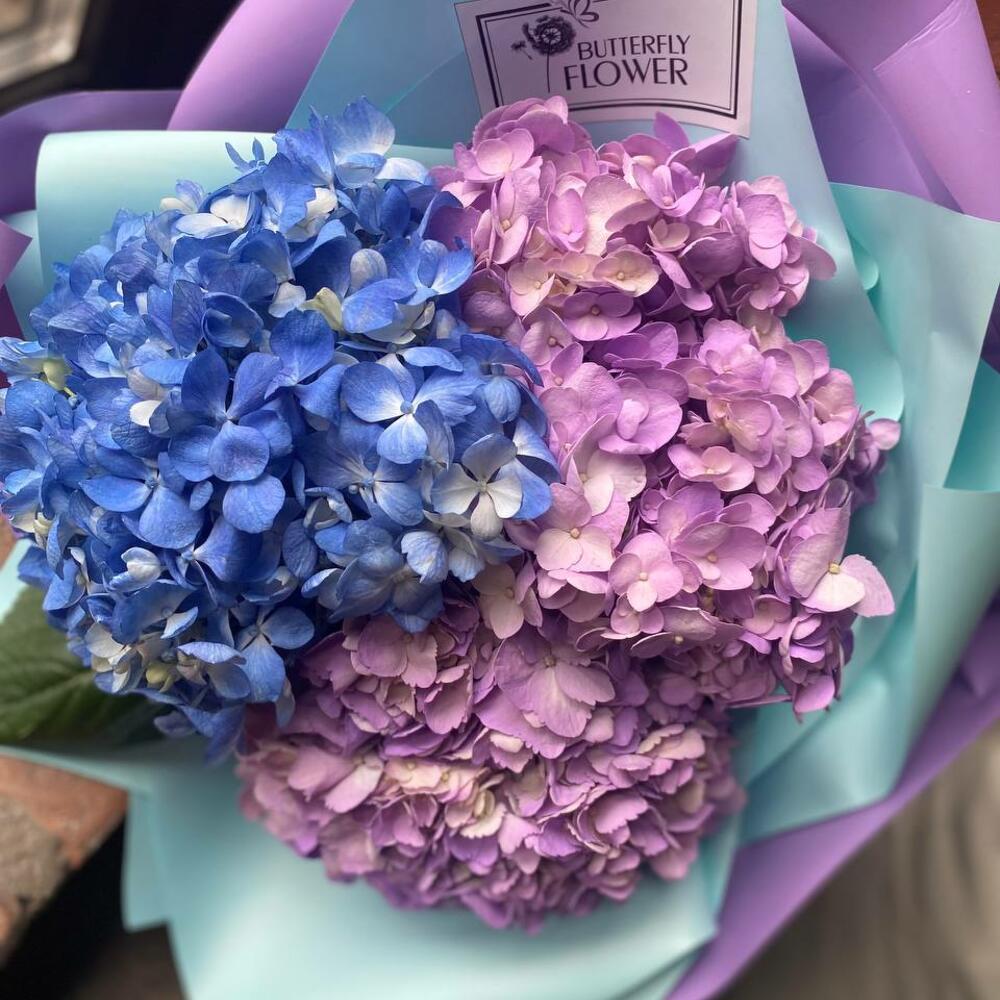 Красивый букет из 3 сиреневых и синих гортензий “Актау”