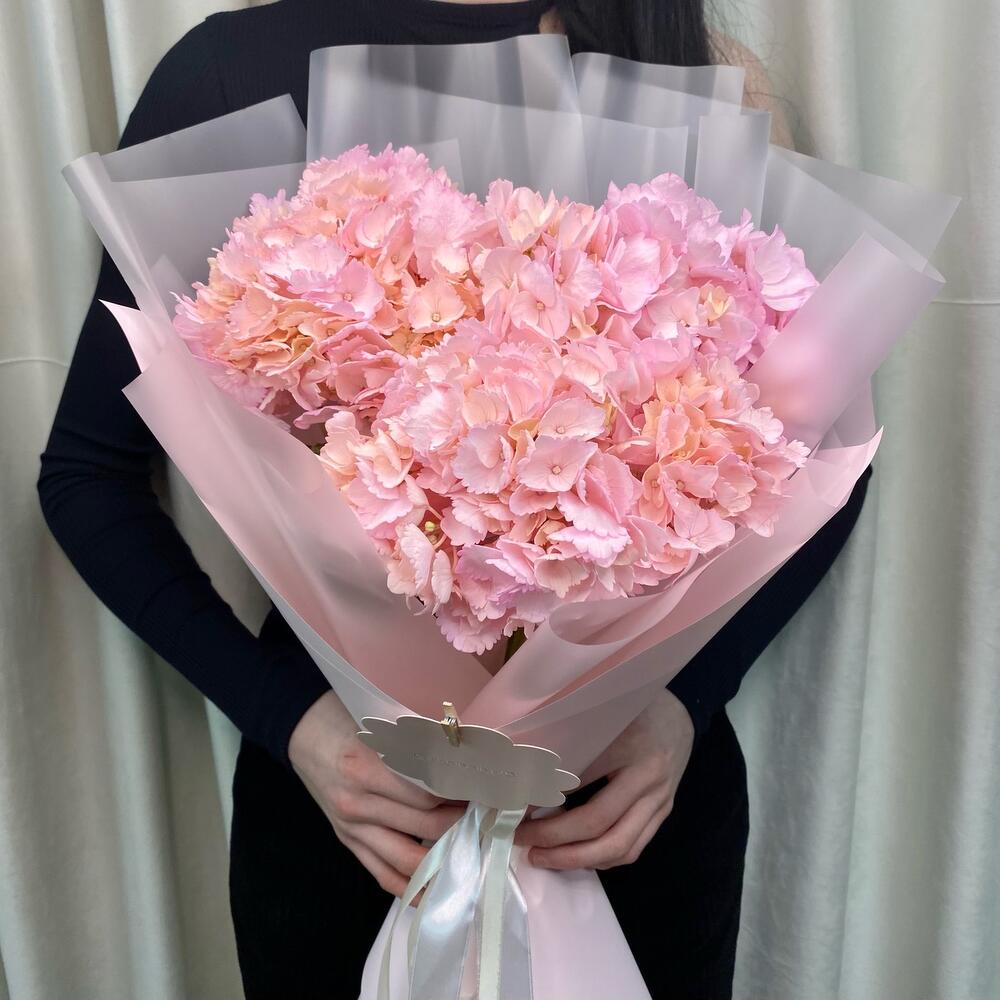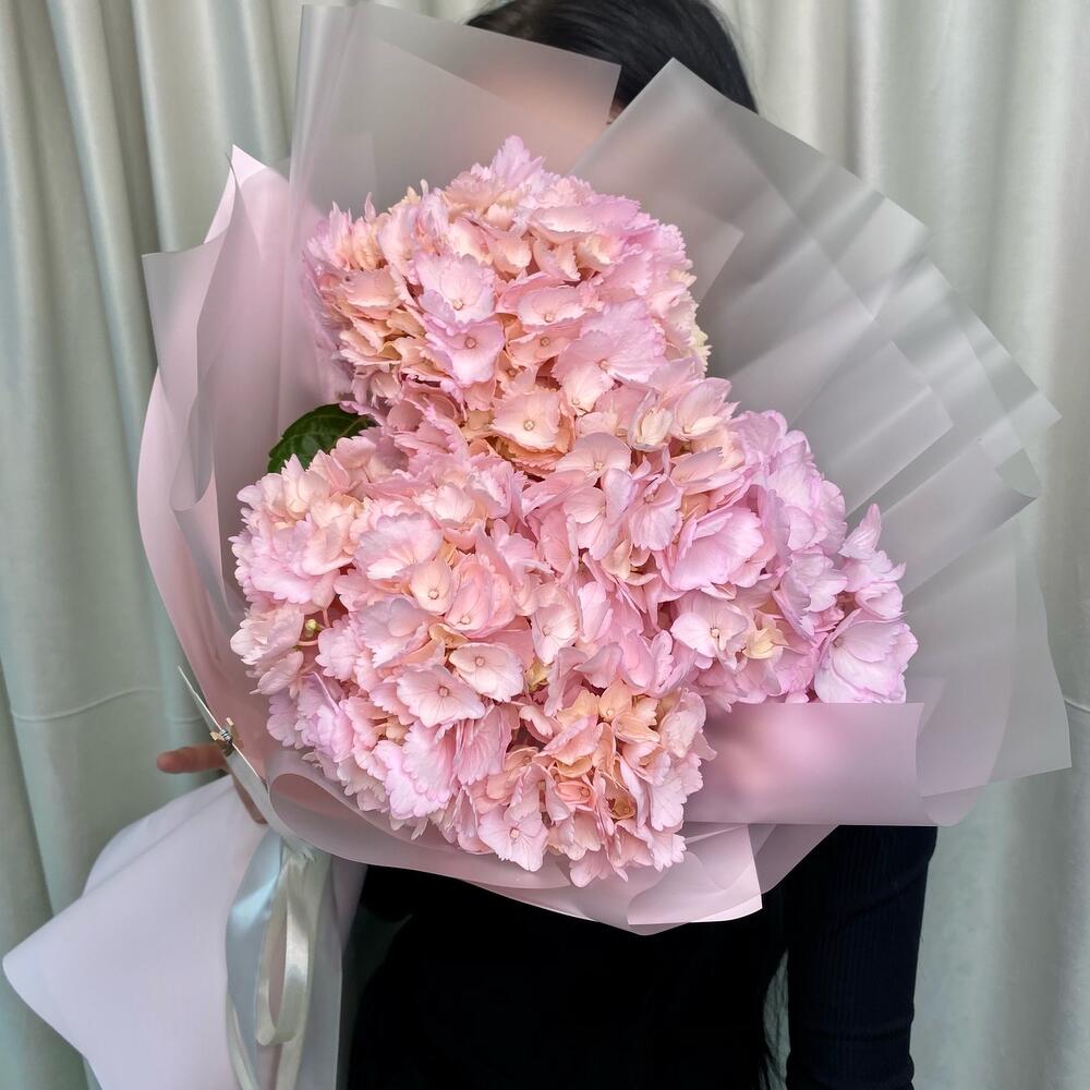 Гортензия – 3 шт.Лента атласная – 1 шт.Пленка матовая – 1 шт.Открыточка с вашими пожеланиями – 1 шт.