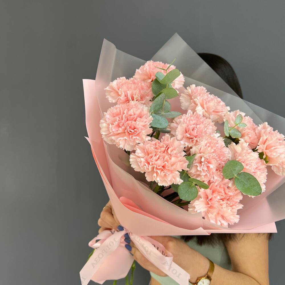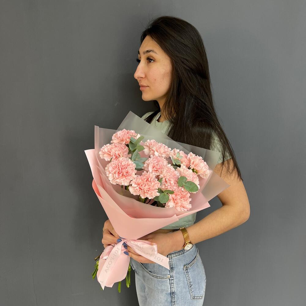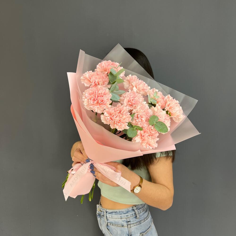 Эвкалипт – 1 шт.Атласная лента – 1 шт.Диантус сортовой – 11 шт.Дизайнерская упаковка – 1 шт.