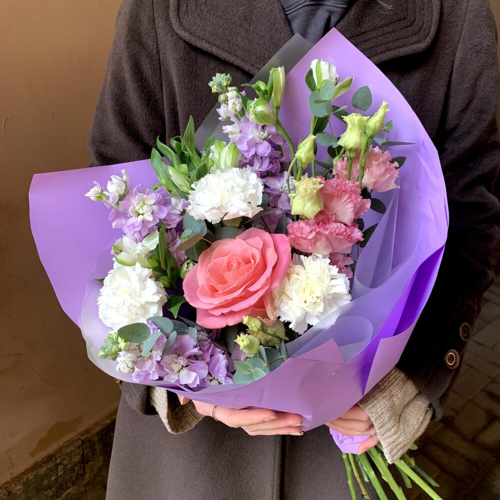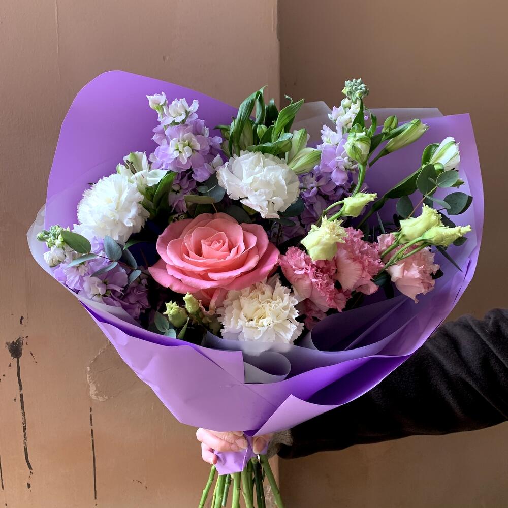 Маттиола – 3 шт.Эвкалипт – 1 шт.Альстромерия белая – 3 шт.Гвоздика белая – 3 шт.Лизиантус розовый – 1 шт.Авторская упаковка – 1 шт.роза розовая гермоза – 1 шт.