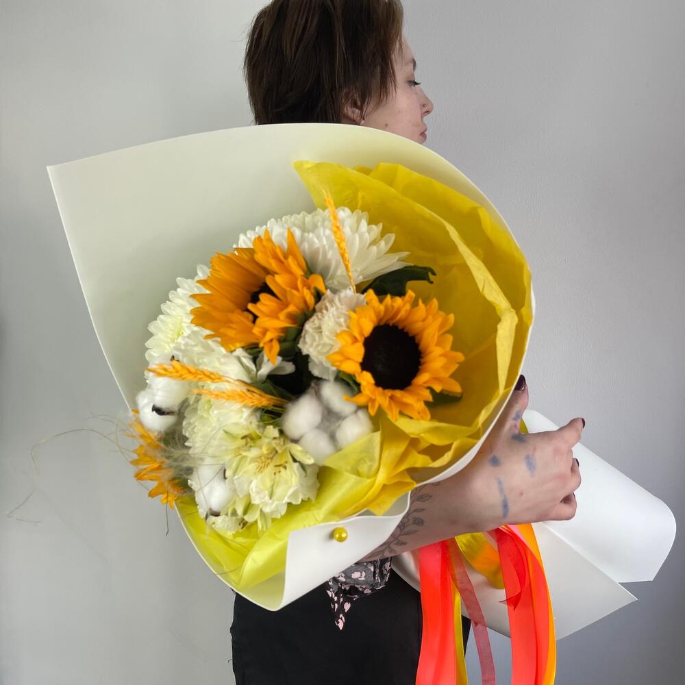 Альстромерия – 1 шт.Хлопок – 3 шт.Лента атласная – 2 шт.Диантус – 3 шт.Подсолнух – 3 шт.Упаковка дизайнерская – 2 шт.Стифа – 1 шт.Пшеница (сухоцвет) – 3 шт.антонов – 3 шт.
