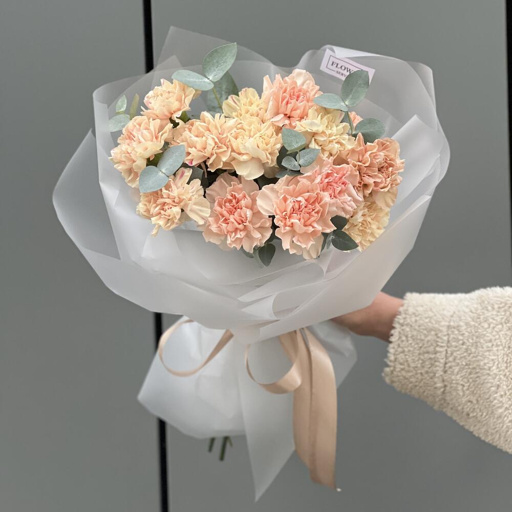 Эвкалипт – 1 шт. Оформление – 1 шт. гвоздика сортовая (диантус) – 15 шт.