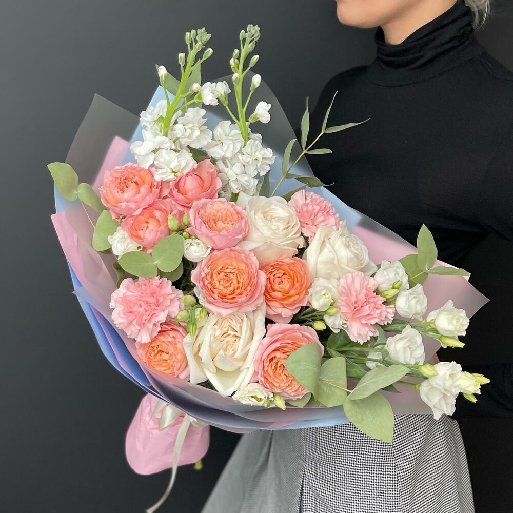 Лизиантус – 2 шт.Маттиола – 2 шт.Эвкалипт – 1 шт.Гвоздика – 3 шт.Фисташка – 3 шт.Упаковка дизайнерская – 3 шт