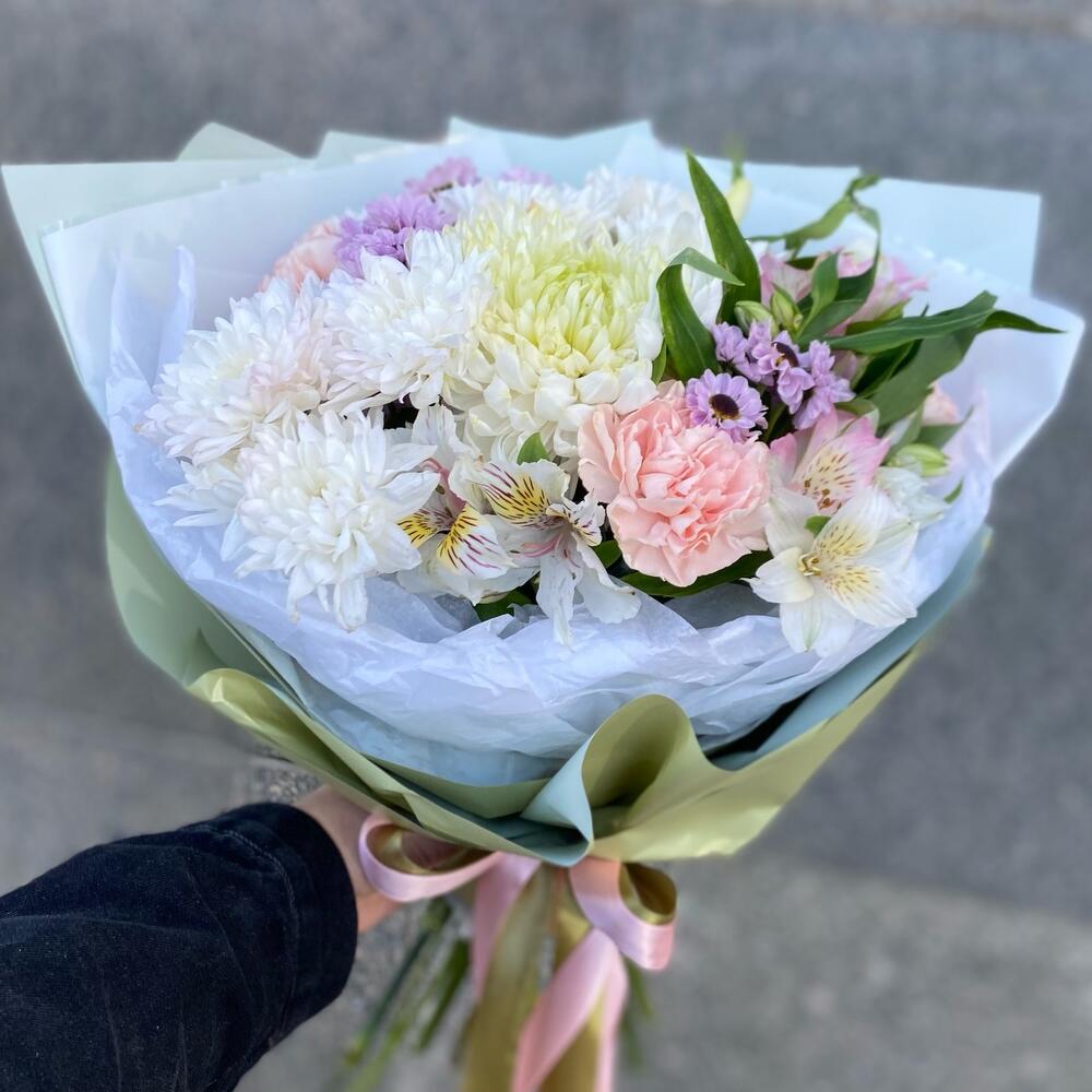 Альстромерия – 4 шт.Хризантема кустовая – 2 шт.Лента атласная – 5 шт.Диантус – 4 шт.Сантини – 3 шт.Упаковка дизайнерская – 7 шт.магнум белый – 1 шт.