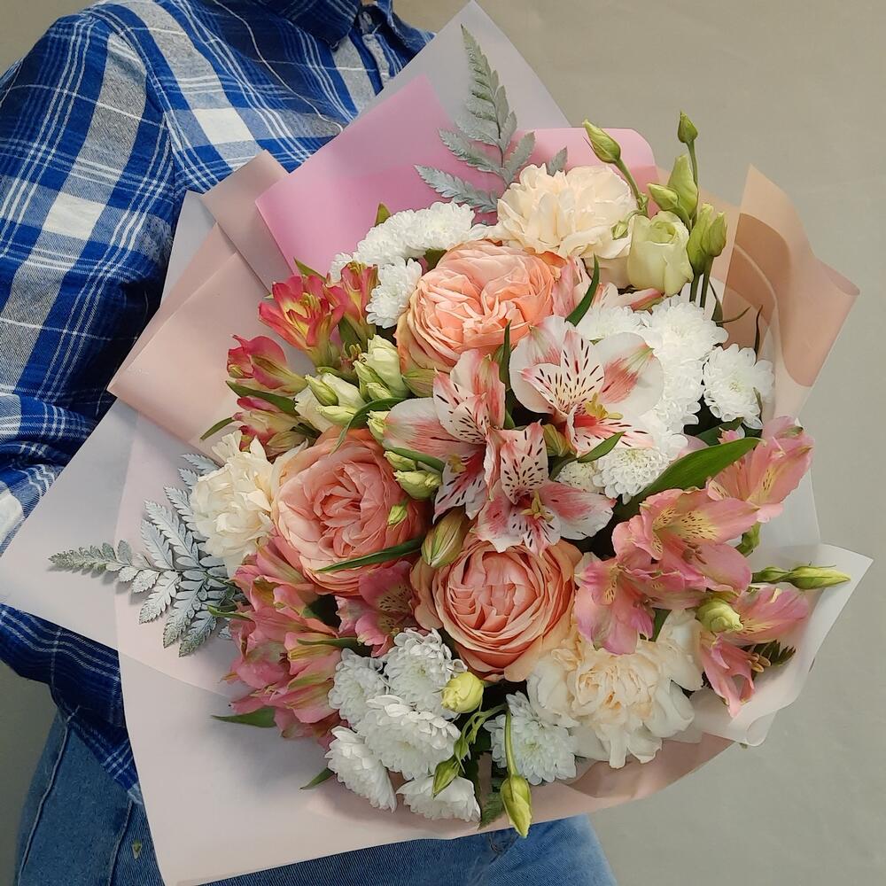 Роза пионовидная – 3 шт.Альстромерия – 4 шт.Сантини – 3 шт.Лизиантус – 3 шт.Диантус – 3 шт.Папоротник – 3 шт.Рускус – 10 шт.Упаковка дизайнерская – 2 шт.Лента атласная – 1 шт.