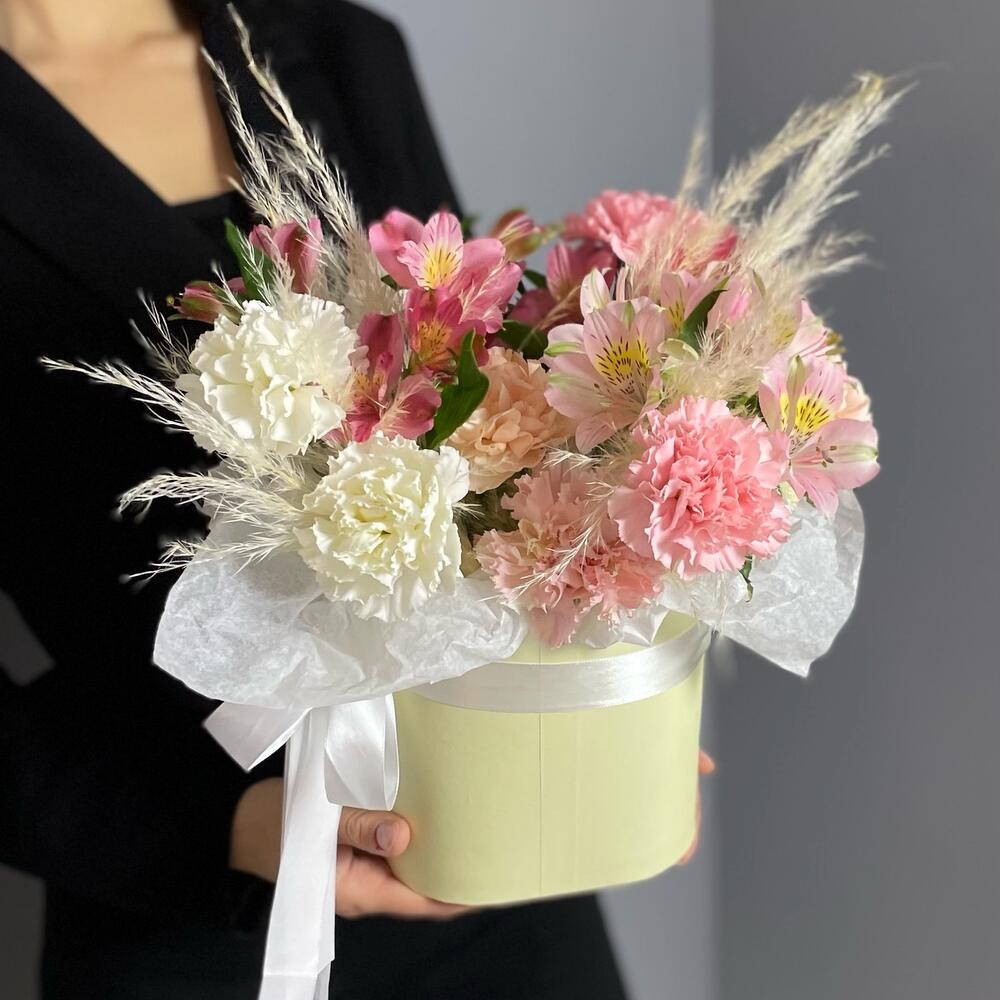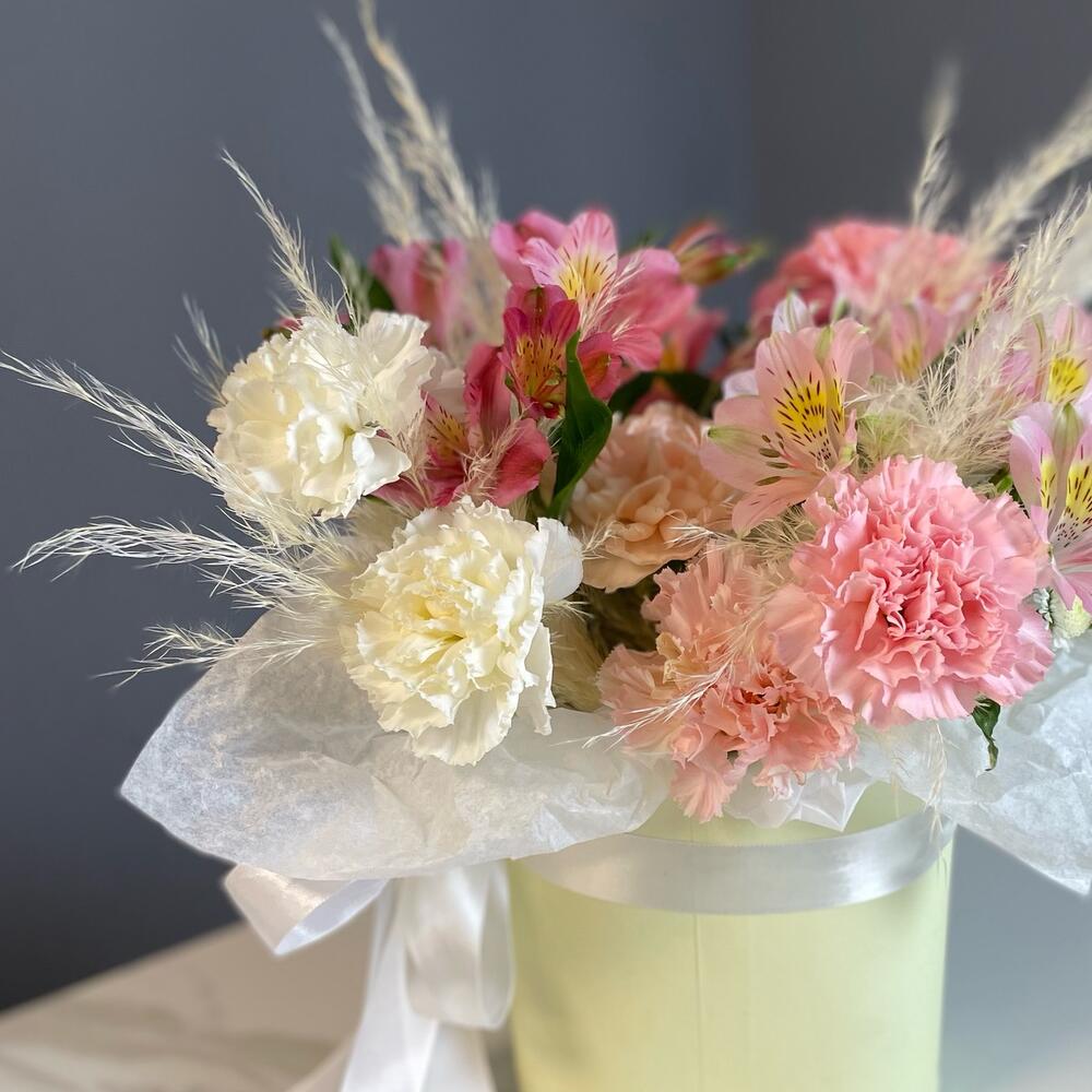 Цветочная композиция из альстромерий и гвоздик в коробке