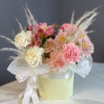 Альстромерия – 3 шт.Гвоздика – 9 шт.Лента атласная – 1 шт.Тишью – 1 шт.Сухоцветы – 3 шт.Шляпная коробка – 1 шт.Оазис флористический – 1 шт.