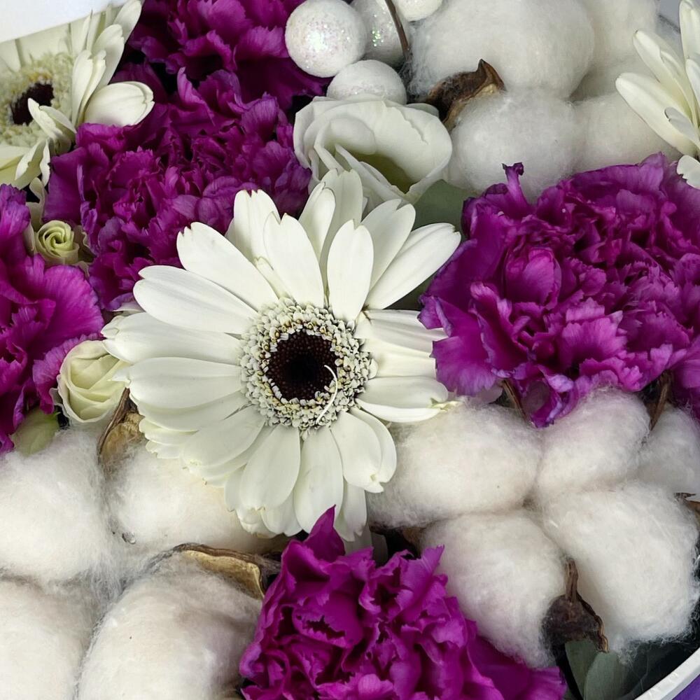 Коробка шляпная – 1 шт.Оазис флористический – 1 шт.Гербера мини белая – 2 шт.гвоздика фиолетовая “мунаква” – 4 шт.Хлопок натуральный – 3 шт.эустома белая – 1 шт.Ягоды декор – 1 шт.Эвкалипт – 1 шт.