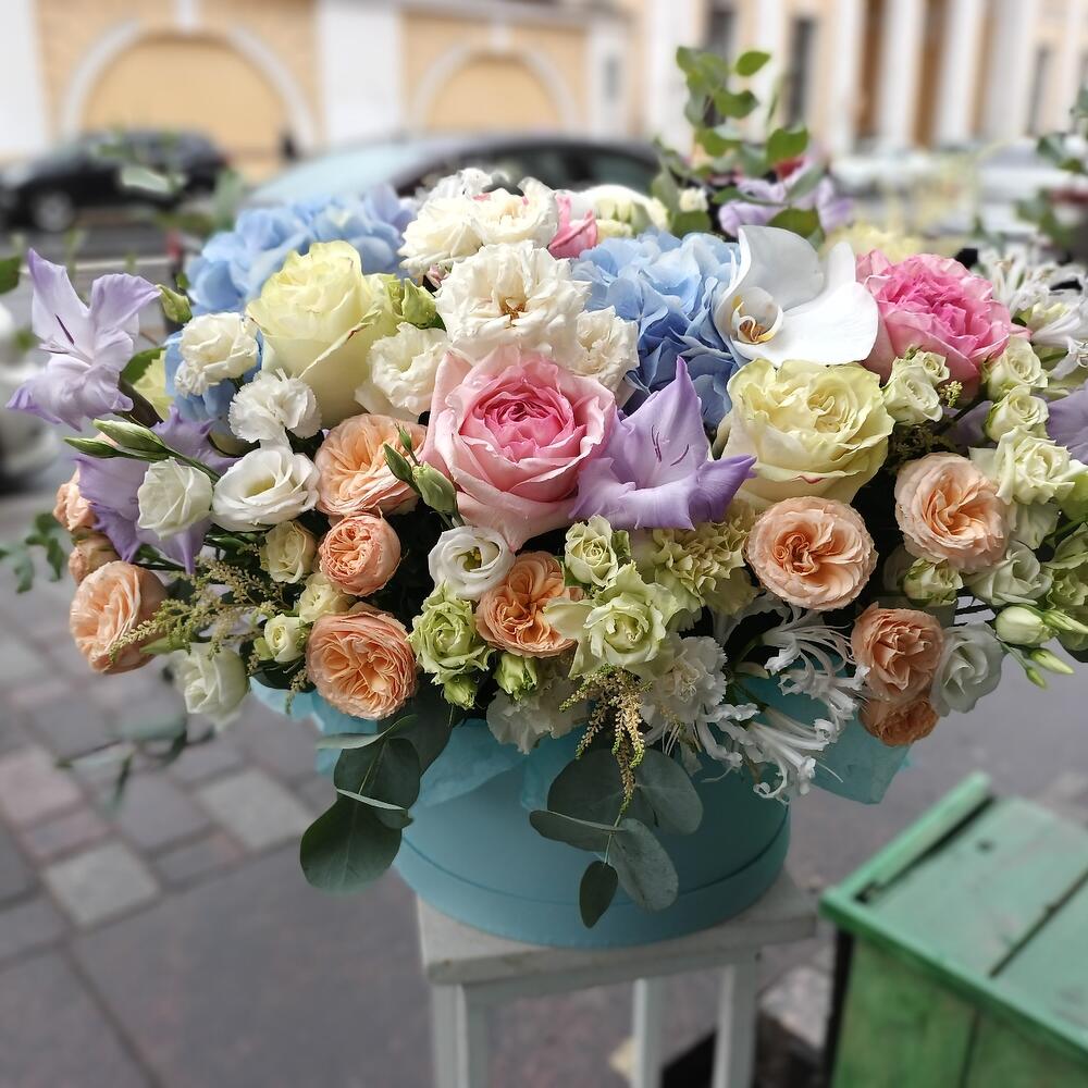 Коробка шляпная – 1 шт.Калька упаковка – 4 шт.оазис флористический кирпич – 2 шт.гортензии – 3 шт.Эвкалипт – 10 шт.Лизиантус – 5 шт.Астильба – 5 шт.Гладиолус – 3 шт.розы кустовые пионовидные – 7 шт.розы кустовые – 10 шт.Нерина – 5 шт.розы пионовидные – 7 шт.орхидея – 3 шт.Диантус кустовой – 7 шт.